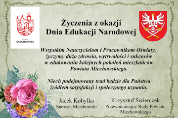 Z okazji Dnia Edukacji Narodowej, Starosta Miechowski Jacek Kobyłka i Przewodniczący Rady Powiatu Krzysztof Świerczek, wszystkim Nauczycielom i Pracownikom Oświaty, życzą tak ważnego w tych czasach zdrowia, wytrwałości i sukcesów w edukowaniu kolejnych pokoleń mieszkańców Powiatu Miechowskiego.