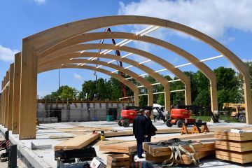 Budowa budynku hali sportowej z dachem łukowym o konstrukcji lekkiej szkieletowej z dźwigarów z drewna klejonego, opartym w sposób przegubowy na słupach żelbetowych utwierdzonych w stopach fundamentowych oraz zaplecza socjalnego w konstrukcji tradycyjnej murowo żelbetowej.